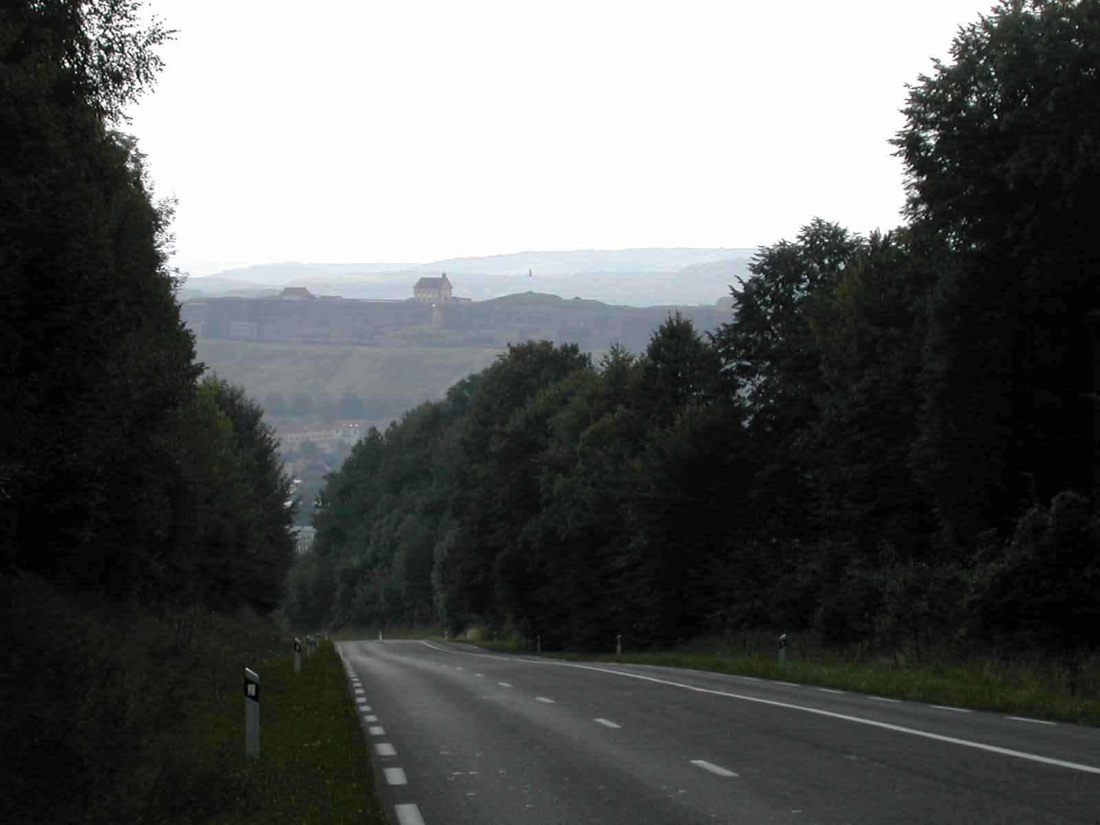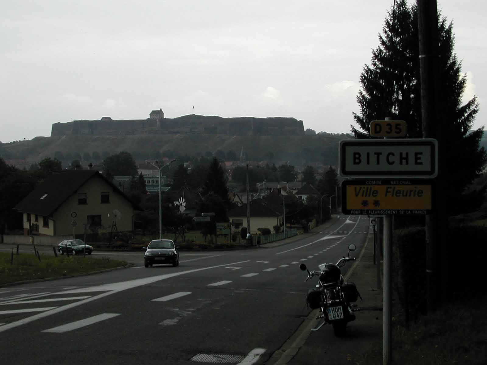 Dann machen wir einen Schlenker auf Bitche zu, dessen Burg-Berg mit Kapelle hier leicht im Dunst vernebelt wird.