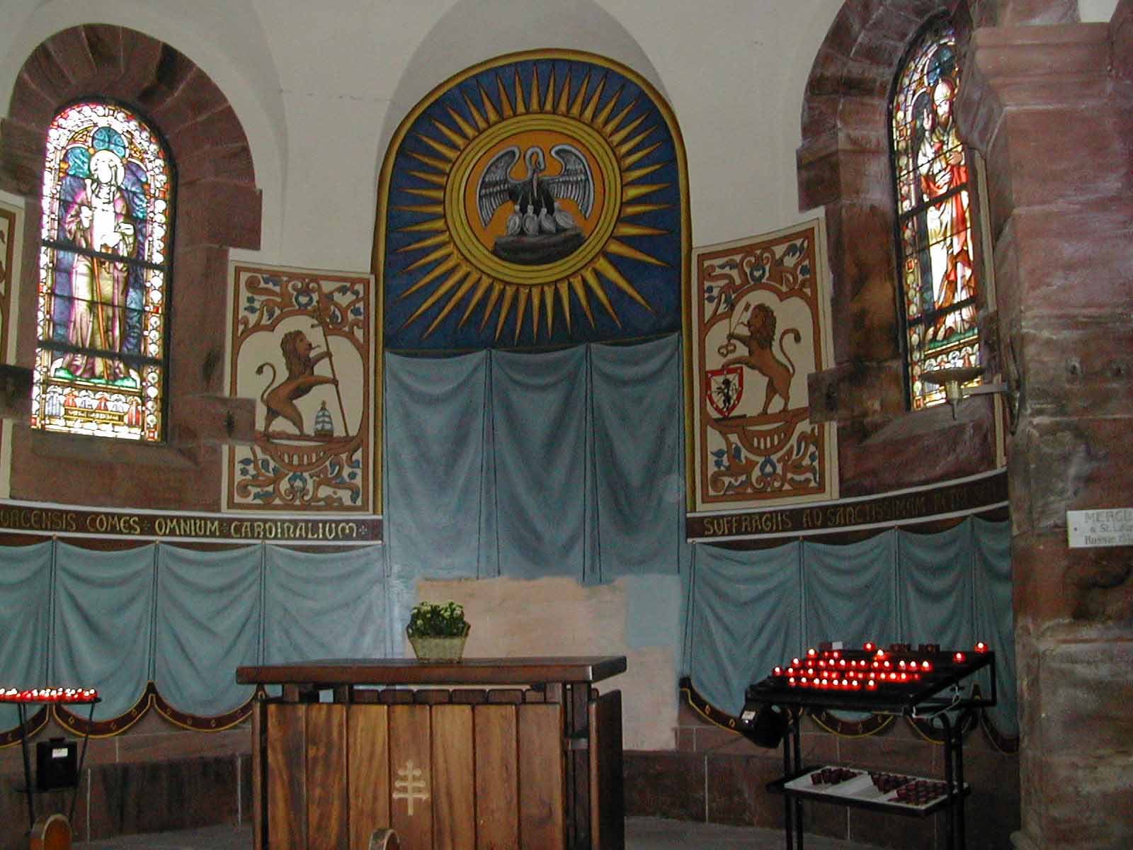 Innen ganz typisch mit Vorhängen geschmückt, ein Löwe rechts, ein Löwe links, viele Kerzen und ein Blumentopf auf dem Altar, auf dem soeben noch der Leib Jesu gelegen hat...